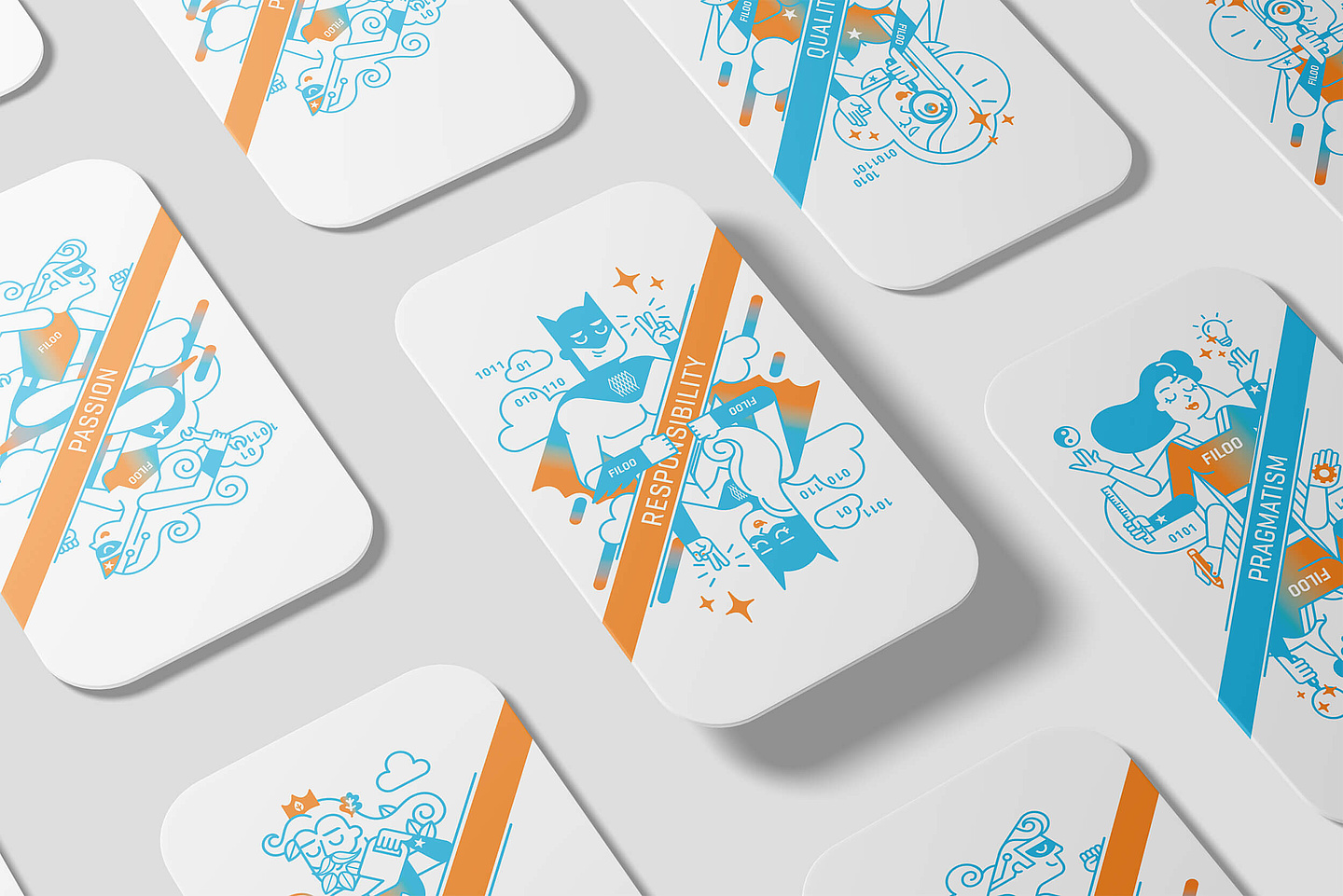Mit den Wertehelden von filoo haben wir 6 Protagonisten im Corporate Illustrations-Stil entwickelt, die die Key Values des Unternehmens repräsentieren. Die Filoo-Wertehelden sind im Büro überall präsent, um ihre Botschaft zu transportieren.